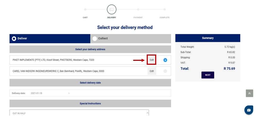 a) Once you have added items to your cart, start the checkout process. When you get to the “Select your delivery method” page, click the “EDIT” button next to the delivery address you would like to change to.