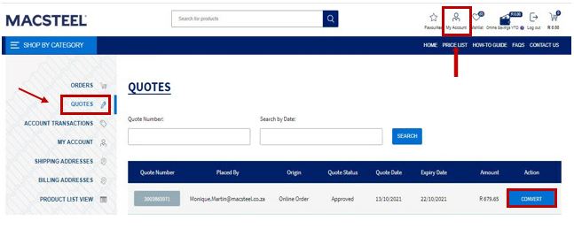 a) If you would like to convert a quote at a later date, you can do so by clicking on the "My Account" icon, found on the top right of your screen. Once in the "My Account" section, on the left menu panel, click on the “Quotes” tab to see your quote history.