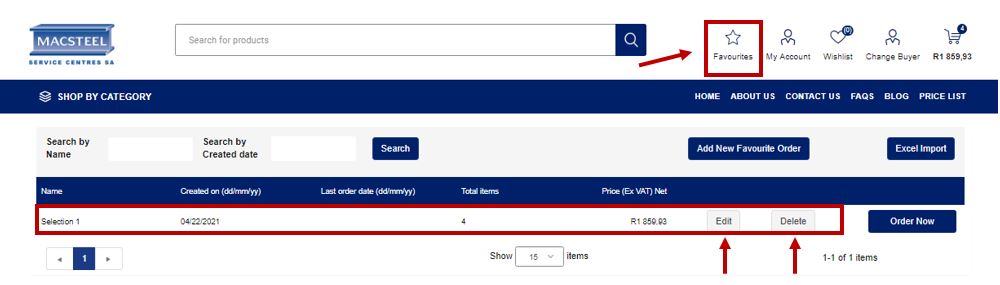 d) To view your saved list, click on the Favourites (star) icon on the top right of your screen. You will be given the option to edit, delete or place an order on your selected list.