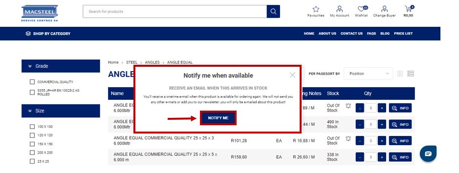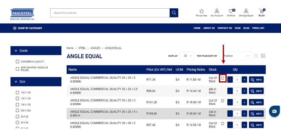 a) Click on the bell on the right of the product next to “Out Of Stock” if you wish to be notified when products are back in stock.