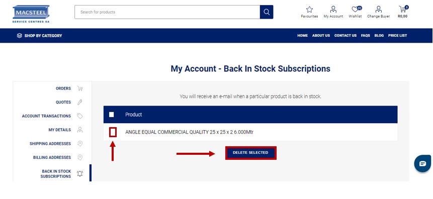 d) If you no longer wish to be notified when the product is back in stock you may delete your request for a reminder by clicking on the box next to the product and on "Delete Selected".