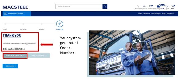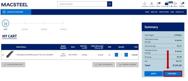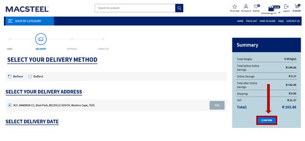 4. On the next page, select your delivery method (delivery or collect) and enter any special instructions you have for your order. If you would like your order to delivered to an address different to your approved default delivery address, you can edit your delivery address on this checkout page. If you are an account customer, find out more on how to do this by reading this how-to article: https://shop.macsteel.co.za/6how-to-edit-your-delivery-address.