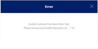 Please note that you should not use any special characters in your purchase order number, such as & ` , " or #, as this will provide an error and ask you to change your entry.