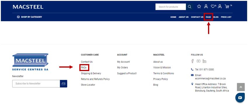You can view Frequently Asked Questions either by clicking on "FAQS" at the top of the screen or by scrolling down and clicking on "FAQS" at the bottom.